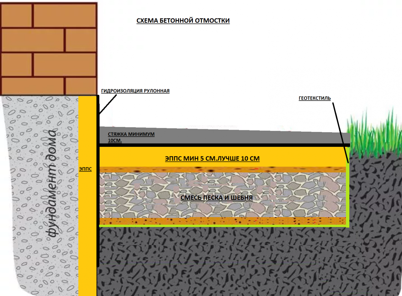 Отмостка вокруг дома — это обязательный элемент защиты фундамента и стен здания от воздействия атмосферных осадков и влаги. Она представляет собой плотное покрытие шириной от 60 см до 1,5 м, примыкающее к зданию по всему периметру. Правильное устройство отмостки увеличивает срок службы дома, предотвращает просадку грунта и образование трещин в фундаменте.